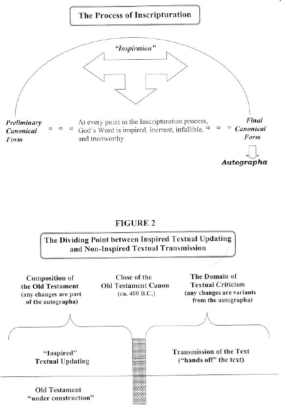 4. The close of the OT canon, that is, the time when no more biblical books were being composed and God's revelation of his will for humanity had ceased (as it relates to the OT) functions as the dividing line between inspired editorial activity and uninspired scribal activity (see figure 2). Modernizations, explanatory glosses, and any similar phenomena can be described as inspired editorial activity only if they are part of the compositional history of the OT, that is, before the close of the OT canon. In other words, editorial updating that took place prior to the close of the canon belongs to the process of inscripturation and is part of the inspired, in- errant text of Scripture. Any updating that takes place after that juncture belongs to the domain of textual criticism and represents a variant from the autographa.